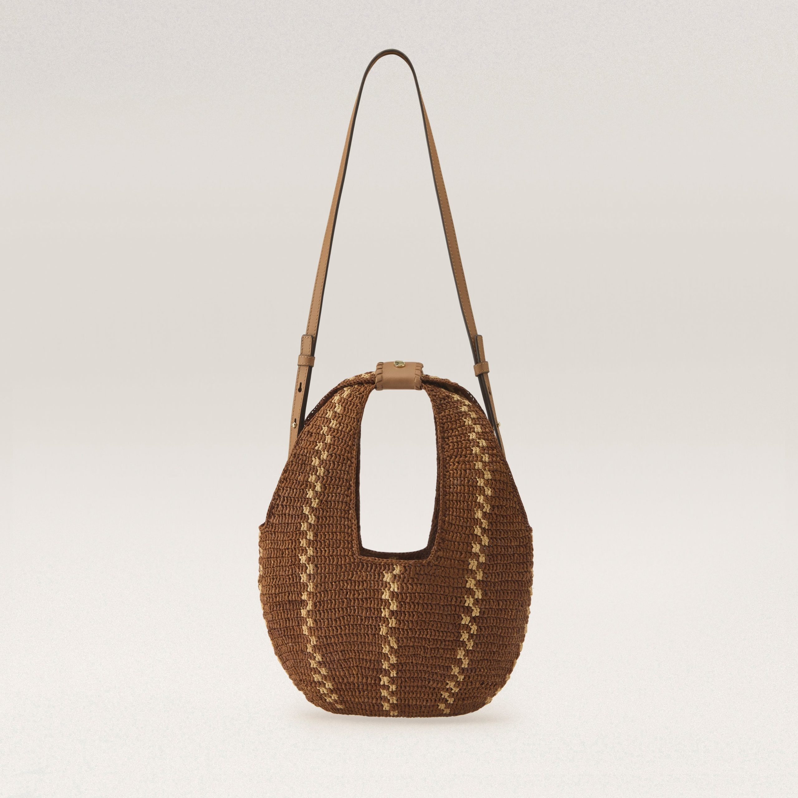 Introducing the Aquarius Hobo, a showpiece of the season. A feat of craftsmanship, each bag takes over 37 hours to complete and is hand-crocheted in the intricate Nagaraya stitch – one of the most complex techniques. Stitched one row at a time, the artisan carefully counts and controls each raffia leaf to ensure a precise and flawless silhouette. The four-piece leather handles are adorned with whipstitch detail and signature seed snap buttons. Unlined for a lightweight feel, with an easy 24cm handle drop, Aquarius is the perfect companion for your next trip. Mini Hobo Bag Hand Crafted Raffia Crochet in Kūru Stitch 37.8 hours to produce Vertical Stripe Contrast LWG Certified Leather Strap and Handles w/Whipstitch Detail Signature Seed Snap Button Unlined Height38cm Width28cm Depth4.5cm Handle Drop18cm Strap 55-/+2.5cm