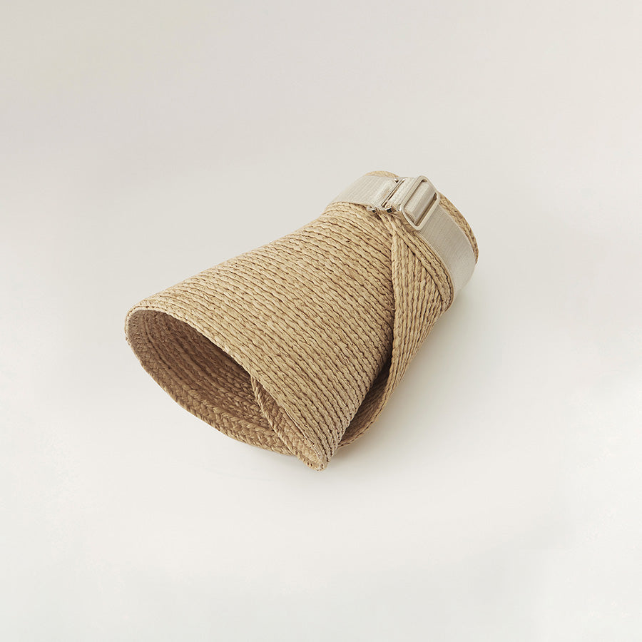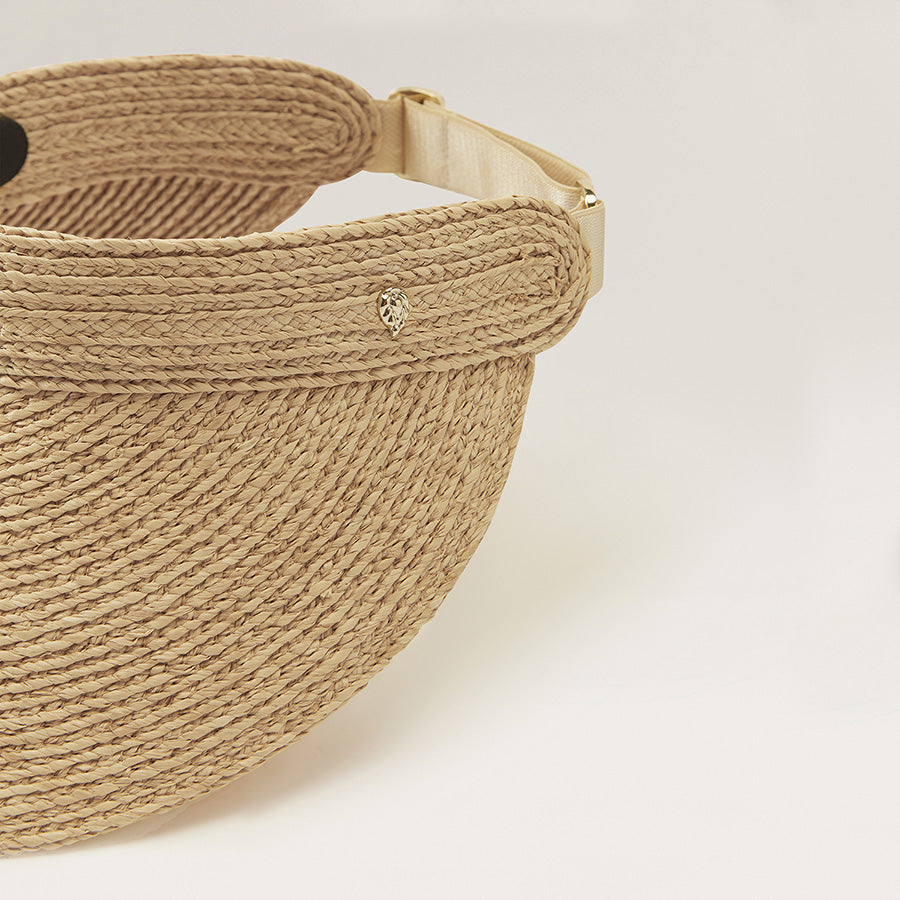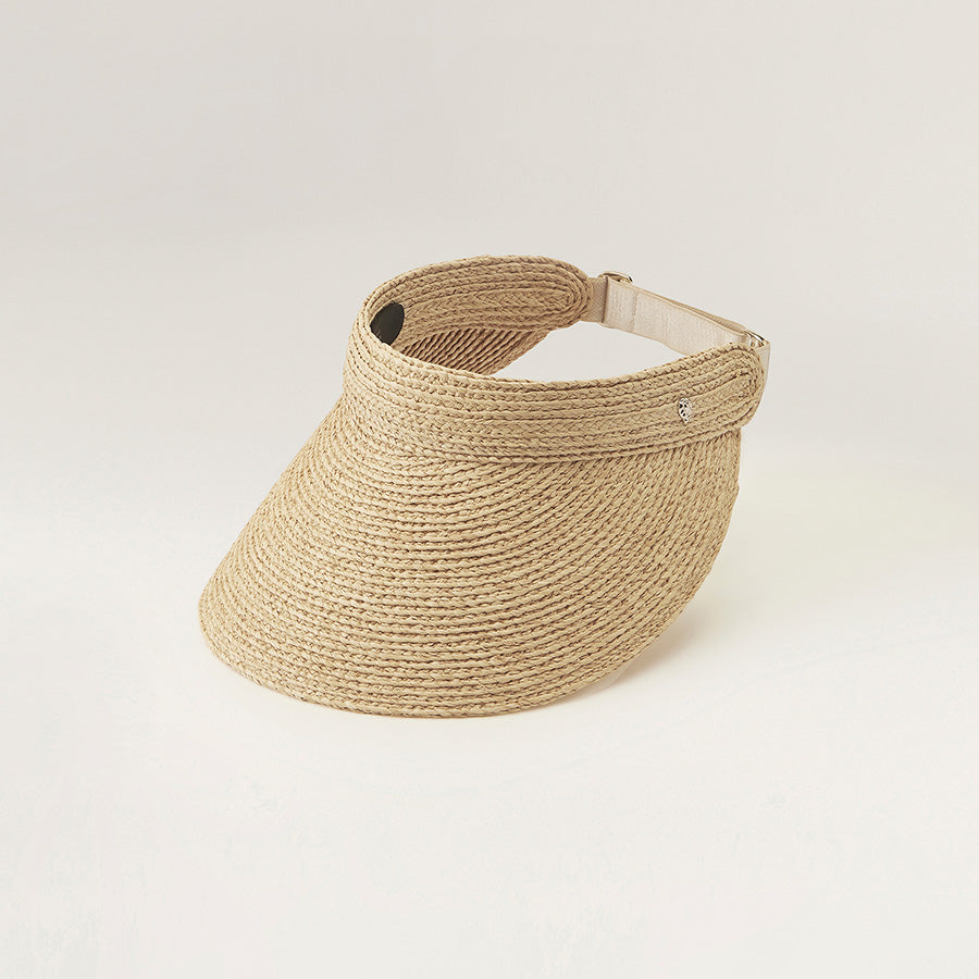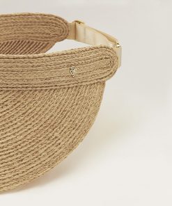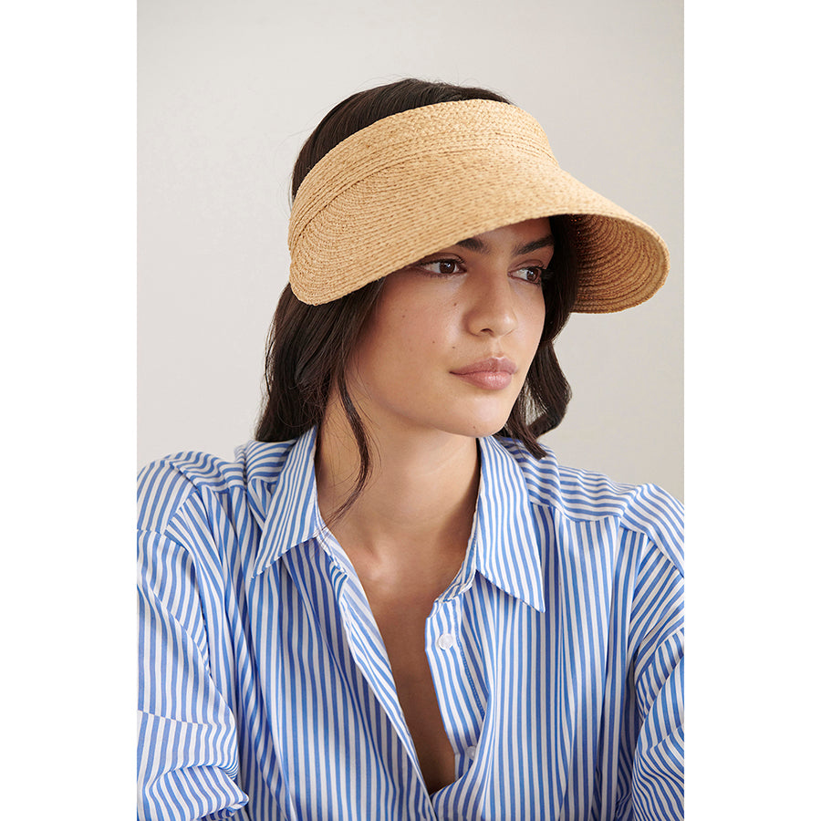 Delightful all year round, Kirsten is crafted from sustainably harvested, hand-braided Madagascan raffia. The style features a 12cm peak, inner neoprene band and size adjustable elastic fastening. Rollable and designed with a securing hook, Kirsten makes for the perfect casual off-duty travel or daily walk companion. Pull-on Rollable Visor Wide Peak 12cm Peak Hook Hardware for Rollability Sateen Elastic Size Adjustable Outer Band Neoprene Inner Band Rollable u0026amp; Packable Style Sold With Printed Logo Cloth Bag