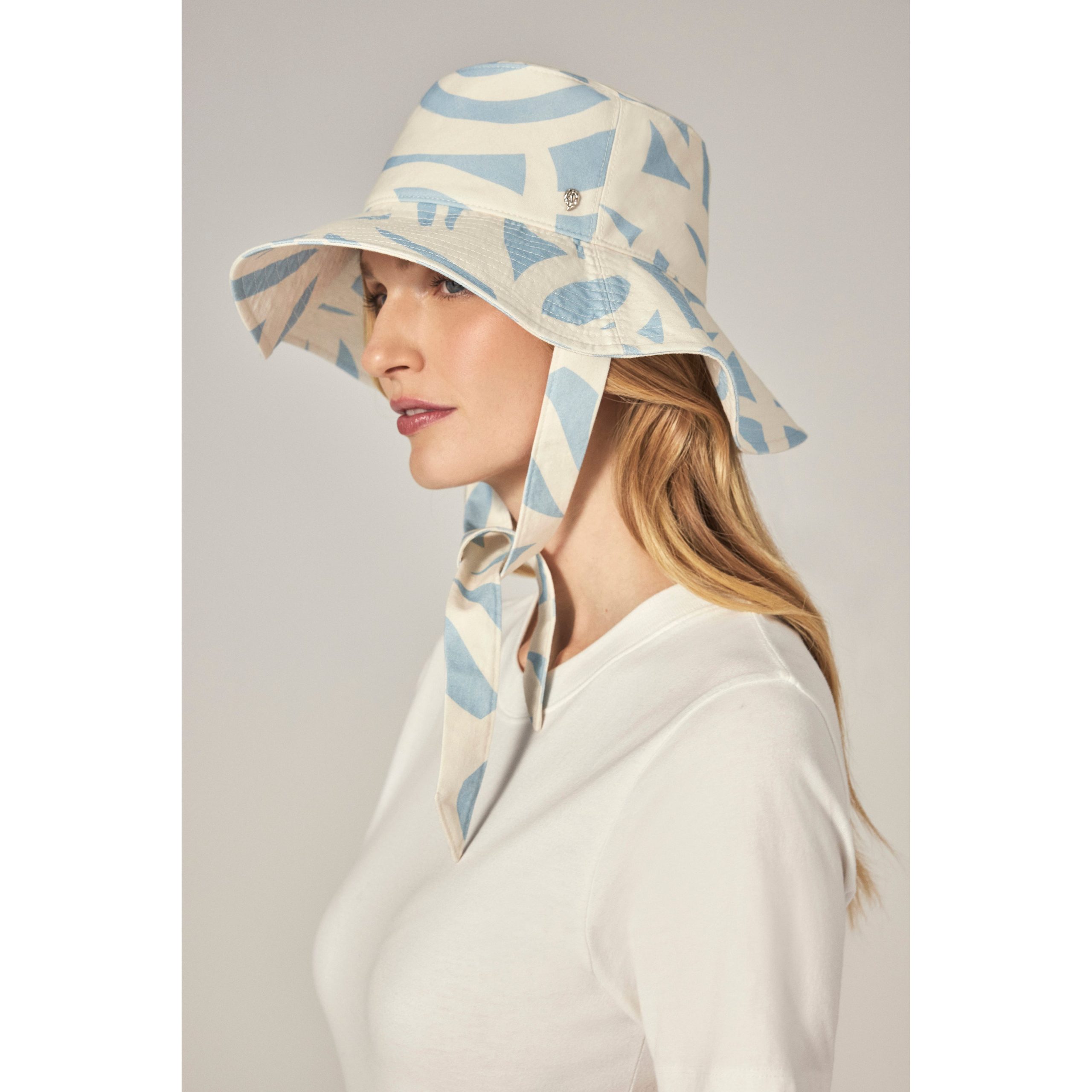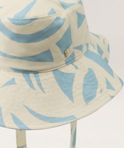 Malibu bucket hat features an exclusive geometric print inspired by the ocean, bringing a fresh, coastal vibe to your look. Made from organic cotton yarn, it offers adjustable chin strap ties in the same vibrant print and provides UPF 50+ protection for sunny days. Medium Brim Bucket Hat GOTS Certified Organic Cotton Yarn Exclusive Geometric Print Inspired by the Ocean 9cm Brim Chin Strap Adjustable Ties in Main Print Size Adjustable Lining Channel for Fit Lightweight Cotton Fitted Lining UPF 50+